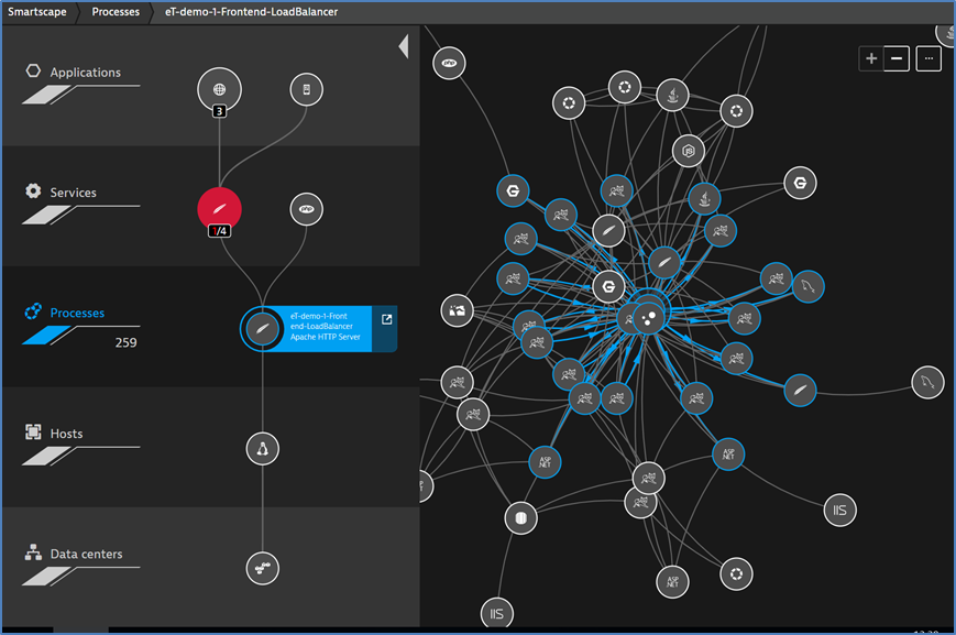 Dynatrace通过专利的SmartScape和PurePath技术,实现对所有服务器、进程、服务、应用以及进入应用的所有交易自动构建全方位多维度的拓扑视图监控和深度的基于人工智能AI的关联分析,自动根因分析和业务影响分析,给出确定答案,从而使得Dynatrace能够实现自动化的主动式性能管理。 SmarScape技术,更符合传统运维的视角,即从数据中心、主机、进程、服务、应用,自下而上或自上而下的展现整个逻辑应用服务与物理主机进程之间的逻辑调用关系。